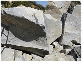 質の良い庵治石の原石を採るには、山を見定めることから始まります。岩盤には自然にできた層があり、その石目やキズが複雑に走っているからです。
