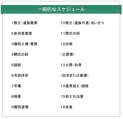 - 納棺、通夜、告別式、出棺、火葬のスケジュールを確認し、式の具体的な内容を決めます。最近ではその人らしいお葬式にするための演出も注目を集めています。心に残るお別れの儀式になるように、要望がある方は相談してみましょう。