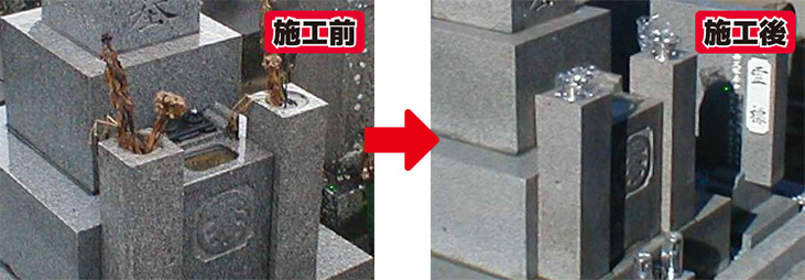 花立ての穴あけ直しとお墓のクリーニングを行い、お墓が美しくよみがえりました。