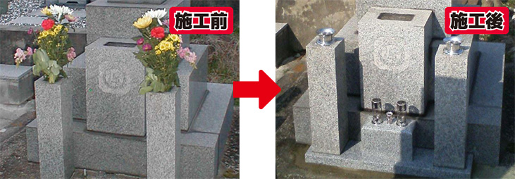 穴あけ直しでステンレス製の花筒をセットし、手前には線香・ローソク立てのともしびセットを設置しています。