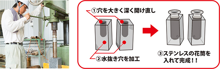 - 花立穴を広く深くあけ直すことで、お花が沢山入る様になります。