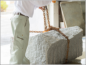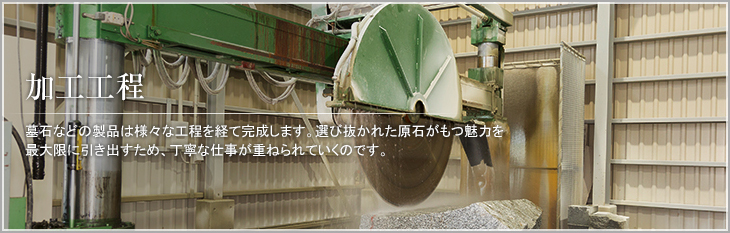 採掘場から採れた石は加工に応じて小割りをして、石材加工工場に運びます。石を削る事は決して容易な作業ではありません。現在ではダイヤモンドカッターブレードで石を切削します。この際、熟練した職人が石の目合い・風合い・キズ・割れ等、様々な石の状況を見極めて切削加工を施します。特に高価で希少な庵治石はとても重要な作業となります。