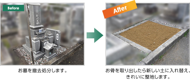 撤去工事費・整地費・処分費・遺骨出し・手続き代行を含む価格です。