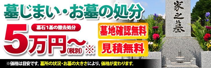 ![墓じまい・お墓の処分 墓石1基の撤去処分 5万円~(税別) [墓地確認無料] [見積無料] ※価格は目安です。墓所の状況・お墓の大きさにより、価格が変わります。](../images/graveclose/title.jpg)