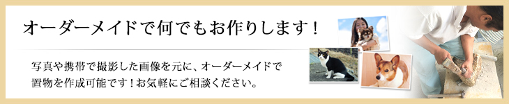 - はい、お客様がお持ちのお写真や携帯に保存している画像などを元にして、オーダーメイドで自由に置物を作成することが可能です。お見積りも無料で作成いたしますので、お気軽にご相談ください。