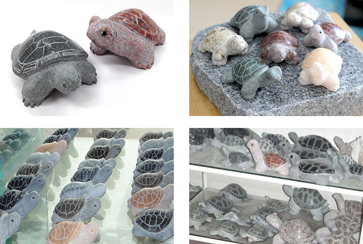 御影石を使った亀の置物です。長寿の象徴として縁起が良いとされる亀。色とりどりの様々な石種を使用した亀の置物を取り揃えております。