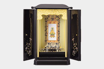 扉に美しい蒔絵が描かれた豪華なミニ仏壇です。