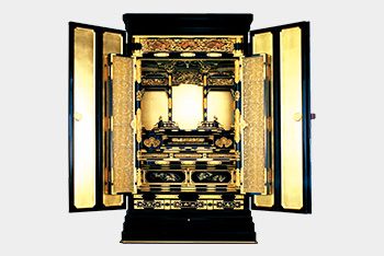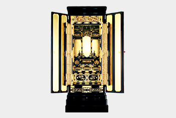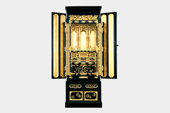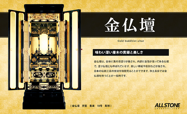 オールストーン各店で取り扱っている金仏壇をご紹介いたします。金仏壇は、全体に黒の漆塗りが施され、内部に金箔が張ってあるお仏壇で、塗り仏壇とも呼ばれています。美しい蒔絵や彫刻などが施され、日本の伝統工芸の技法を垣間見ることができます。浄土真宗では金仏壇を持つことが一般的です。