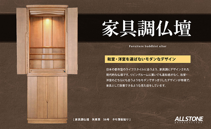 オールストーン各店で取り扱っている家具調仏壇をご紹介いたします。家具調仏壇は、日本の都市型のラ イフスタイルに合うよう、家具調にデザインされた現代的なお仏壇です。リビングルームに置いても違和 感がなく、和室・洋室のどちらにも合うようなモダンですっきりしたデザインが特徴で、家具として設置 できるような見た目をしています。