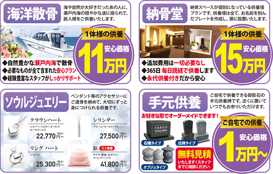 - 墓じまい後のご遺骨の供養もオールストーン高松本店にお任せください!ご予算・ご要望に応じて、お客様に合った供養をご提案いたします。ぜひお気軽にご相談ください。