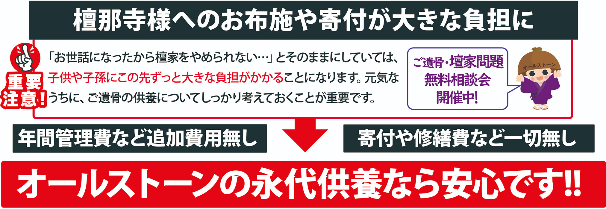壇家の人数が激減している昨今、深刻な問題が1千万円~1億円は必要と言われる寺院本堂の修繕費用です。壇家様1人当たりの負担額が30万円~200万円も必要となるケースもあるようです。その他にもお寺の管理・運営費用も必要で、ほとんどのお寺が今後も長く運営を続けられないと言われています。これらの費用は全て子供・お孫様、永代に渡り子孫の負担と