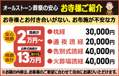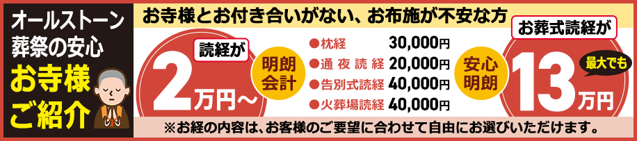 お布施の金額は、お寺や宗派によって異なりますし、お寺との関係、故人様の功績によって異なります。オールストーン・カナクラの紹介の場合は定額になりますので、ご安心ください。