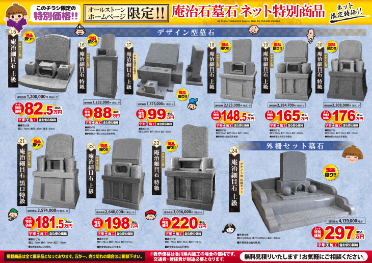※表示価格には基本基礎工事・耐震施工・据付工事・文字彫刻費・お参り付属品(ステンレス花筒・線香立て・ローソク立て)が全て含まれています。