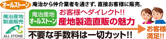 オールストーンは、庵治石の産地庵治町に最新鋭の製造・加工工場を有し、香川県では墓石建立実績No,1を誇ります。品質も価格も、自信をもって皆様にお届けいたします。保証に関しても、産地ならではの庵治石産地証明書を発行させていただきますのでご安心ください。