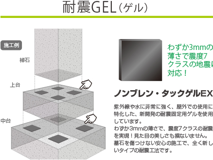 非常に薄く強力な粘着性をもったゲルをお墓のパーツの間に設置することで、しっかり固定して倒れるのを防ぎます。