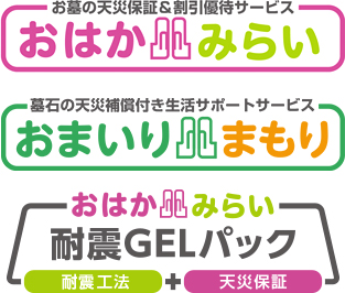 当社の墓石は、お墓の天災保証「おはかみらい」「おまいりまもり」等のサービスにご加入いただけます。地震や津波などの天災でお墓が被害を受けた際、最高100万円まで修復費用を補償するサービスです。万一の時に大きな出費に困らないよう、ご加入をお勧めします。