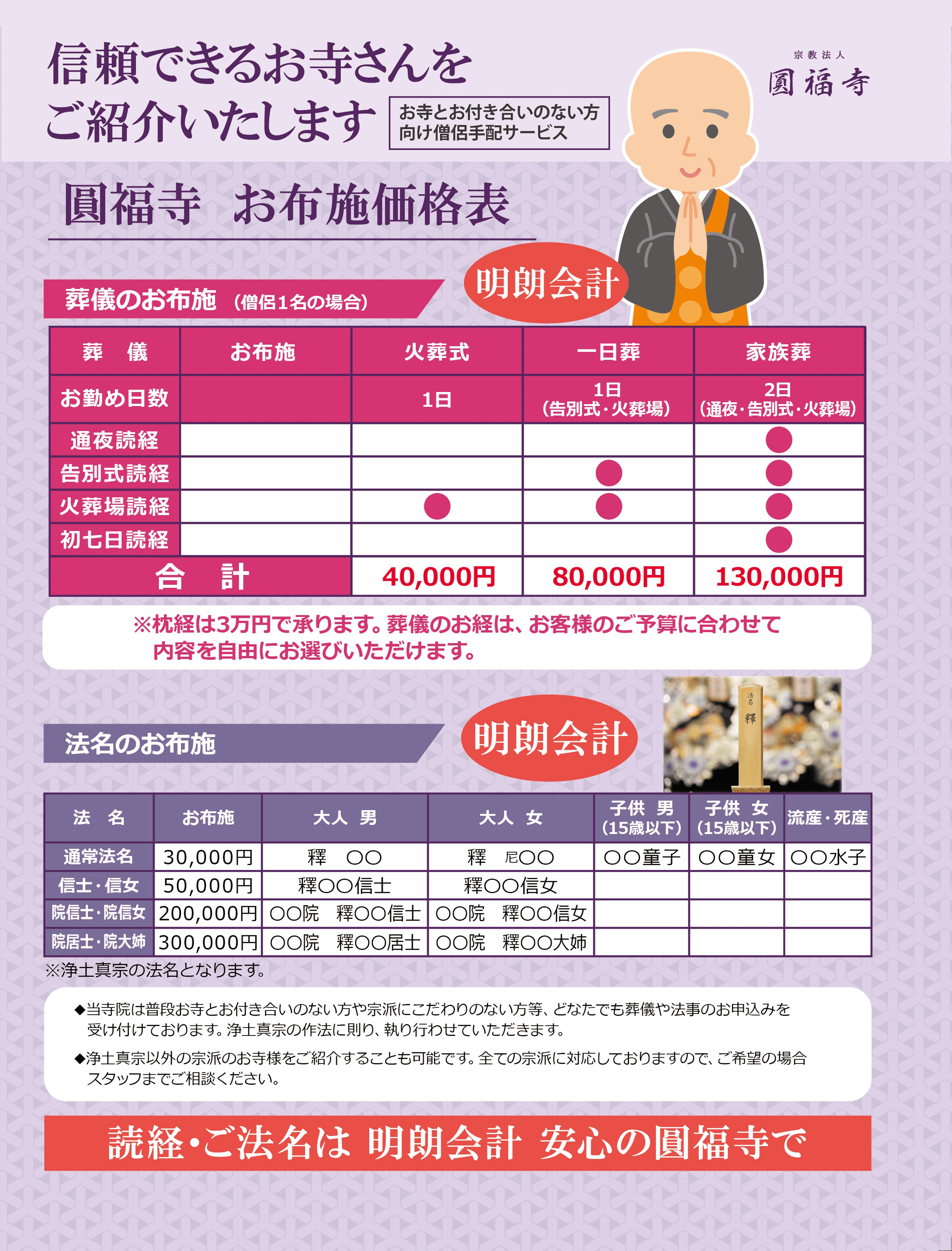 お寺様のお布施 価格表