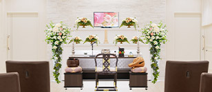 控え室は、明るくカジュアルな雰囲気に仕立て上げました。可愛らしいお花のアレンジメントがお部屋を彩り、式場内のソファやテーブルなどの内装はモダンなデザインに統一されております。和室と洋室の両方をご用意しております。夜間滞在も可能で、まるでご自宅のように落ち着いた空間で、ご葬儀までの間ゆっくりとおくつろぎ頂けます。
