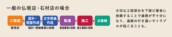 オールストーンでは企業理念でもある【顧客満足第一義】お客様の満足を日々追求し、実現するためにご相談・測量・御提案・設計・文字の原稿作成・製造、加工・文字彫刻・基礎工事・据付施工・耐震施工・保証・アフターサービスに至るまで、すべての部門に熟練の自社専門スタッフが責任をもって担当しております。日本一の銘石庵治石の産地で長年にわたりお墓に携わってきたオールストーンだからできるお墓の自社一貫専門システムです。