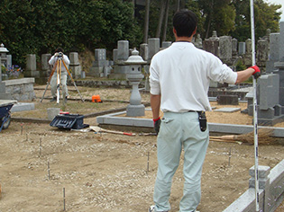 - 墓地での測量の様子です。より精度の高い図面を作成するために、測量も慎重に正確に行います。