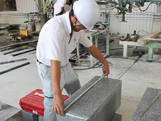 切削・研磨・加工・穴あけ・検品・梱包すべての工程を熟練の技術を持つ石職人が担当させて頂きます。オールストーンではお墓製造加工している工程を見学する事も可能です。