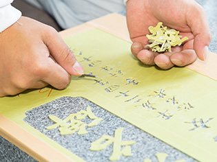 - 文字彫刻原稿のデータから、ゴム原版を作成します。このゴム原版を彫刻面に貼り付け、彫り入れしていきます。