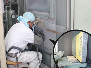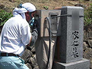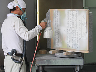 - お墓の正面文字や戒名などを彫り入れていく工程です。サンドブラストという機械で、鉄砂を高圧の空気で吹き付けて彫り入れします。